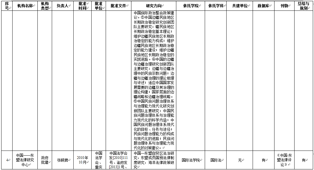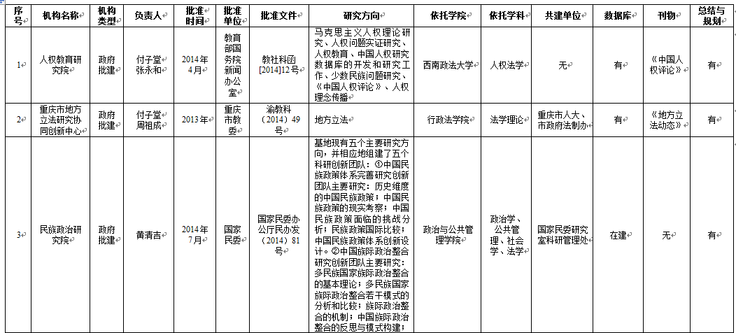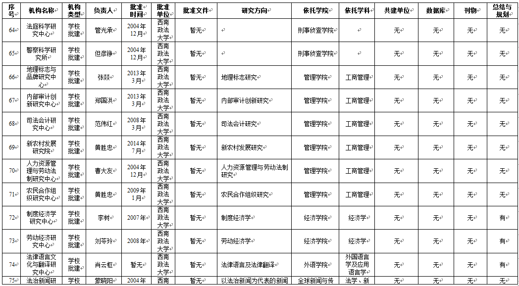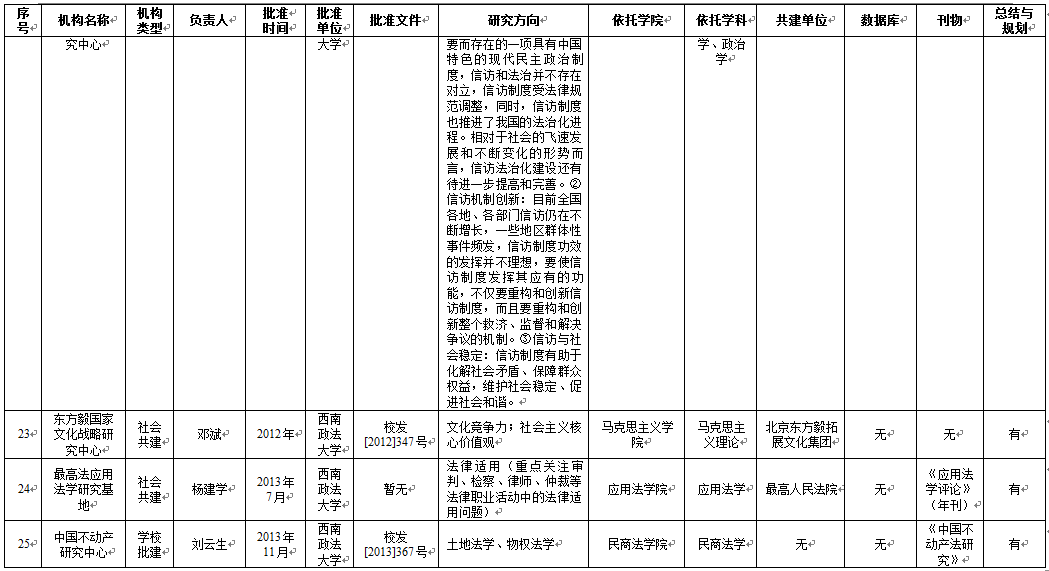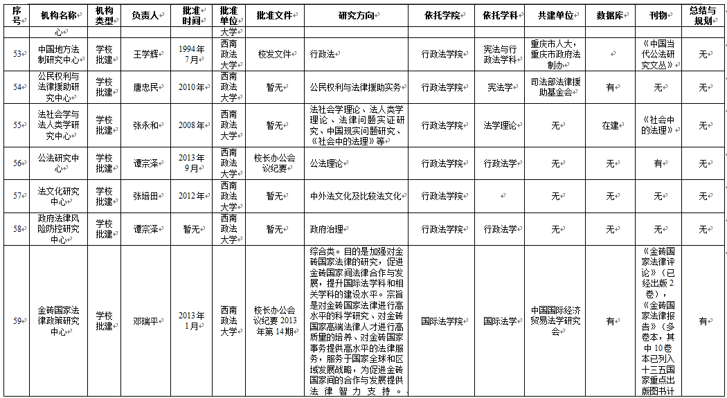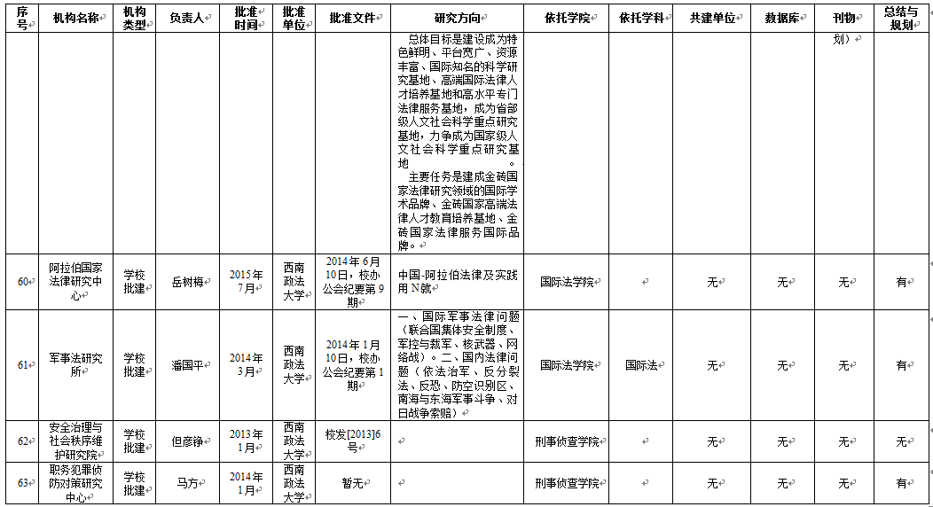 从基地研究方向维度来看,65个科研基地明确填写了研究方向,刑事侦查学院4个基地、民商法学院5个基地、法学院5个基地、行政法学院1个基地、1个学校直属科研基地未明确研究方向。