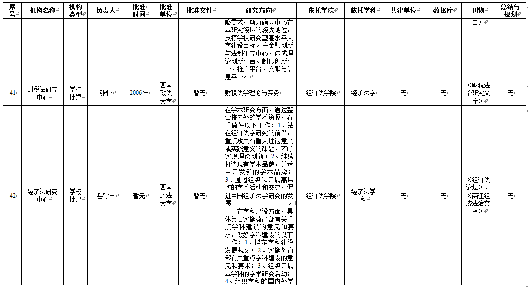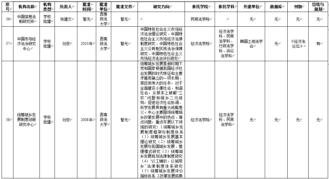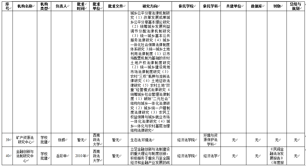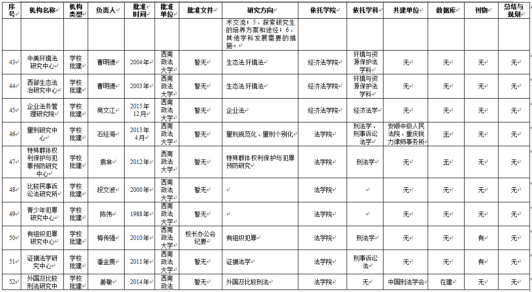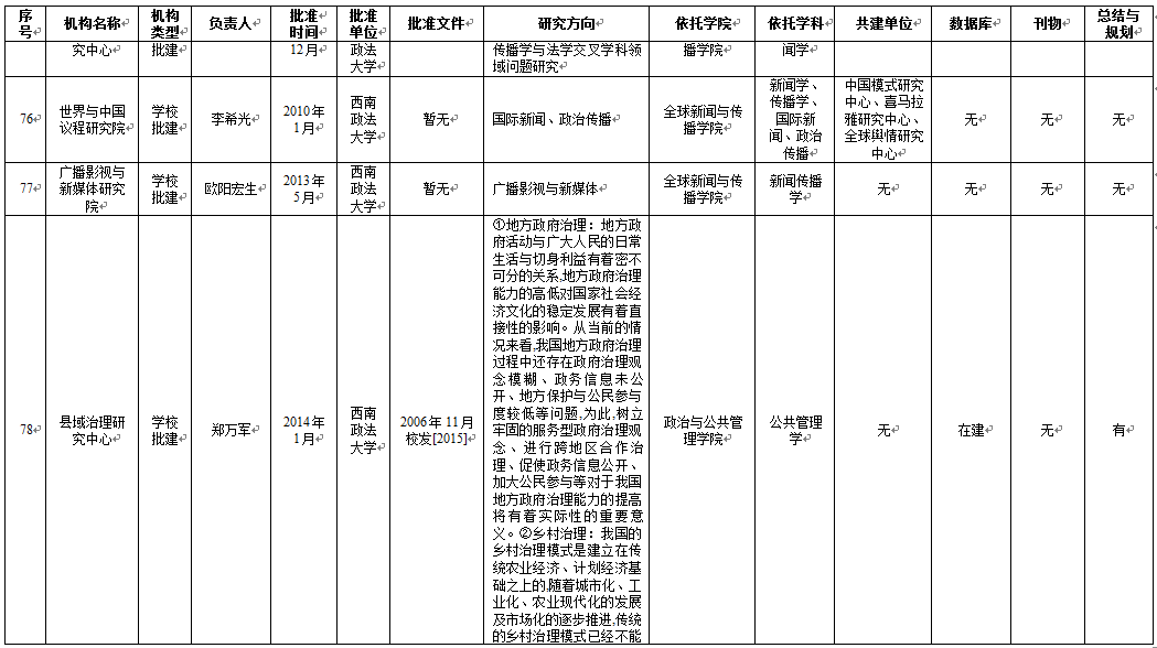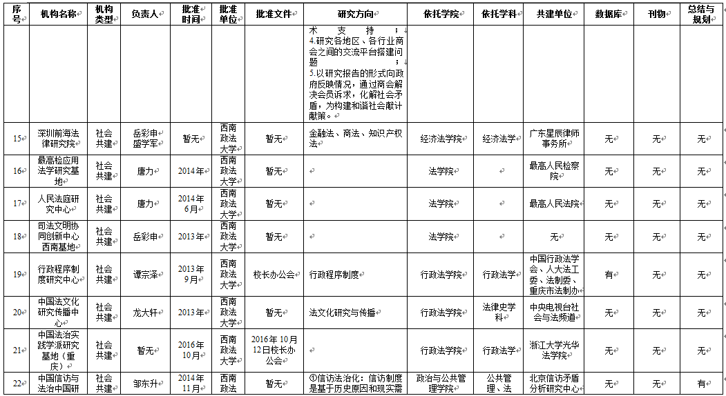 从基地研究方向维度来看,65个科研基地明确填写了研究方向,刑事侦查学院4个基地、民商法学院5个基地、法学院5个基地、行政法学院1个基地、1个学校直属科研基地未明确研究方向。